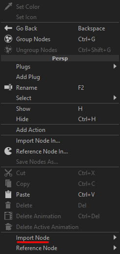 To import (resp. reference) a Node that is not from the Node Library, right-click in the void to open the currently displayed Node’s menu, then choose Import Node In.. (resp. Reference Node In..) and browse the file system to find the Node’s rumbafile.